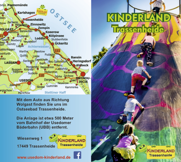 ![]() Wiele atrakcji szczególnie ucieszy dzieci: kucyki, które czekają na pieszczoty i mogą być dosiadane, karuzela dla dzieci do swobodnego użytku, a także Daisine, czyli pojazd na torze wokół stawu. Ponadto dostępne są dmuchany zamek do skakania oraz trampolina, które gwarantują mnóstwo radości. W piaskownicy maluchy mogą kopać w piasku z dostarczonymi zabawkami. Na specjalnie przygotowanej przestrzeni maluchy ścigają się na małych hulajnogach lub pojazdach typu go-kart, a na torze przeszkód czekają kolejne wyzwania. Jest jeszcze wiele innych rzeczy do odkrycia – ogromna kula do skakania o średnicy 10×16 metrów, ekscytujący dom strachów, super zjeżdżalnia, karuzela i wspinaczkowy wulkan. Podczas gdy dzieci testują atrakcje, rodzice mogą zrelaksować się w kawiarni ogrodowej lub odpocząć w leżaku. Kinderland jest otwarte codziennie od marca do października w godzinach 10:00-18:00. W bezpośredniej bliskości Usedom-Park Kinderland znajduje się Farma Motyli Trassenheide, która jest idealnym miejscem do odwiedzenia w ramach wspólnej wycieczki. Z ośrodka wypoczynkowego Kachlin można dotrzeć do Trassenheide samochodem w około 30 minut, w pobliżu Zinnowitz. Dane kontaktowe |